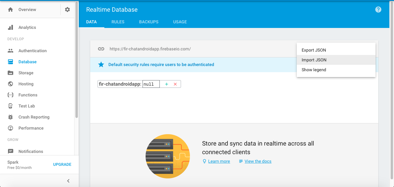 Firebase Database seçeneğini seçtikten sonra bu json formatını import etmemiz gerekiyor ; Import JSON dedikten sonra hazırladığımız json uzantılı dosyayı seçip sisteme yüklüyoruz.