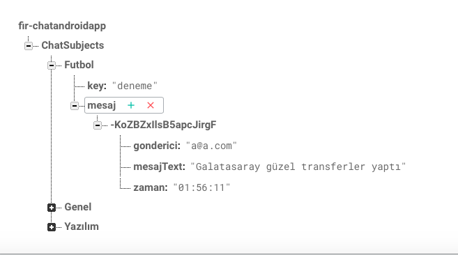 Şimdi Android Firebase Chat Uygulaması içeriğinde kullanacağımız json formatını projemize dahil edelim. Chat uygulamamızda belirli konular var örneğin Yazılım, Genel, Futbol vb. bu konulara tıklayarak sohbet başlatabiliyoruz. json formatımız aşağıdaki gibidir.