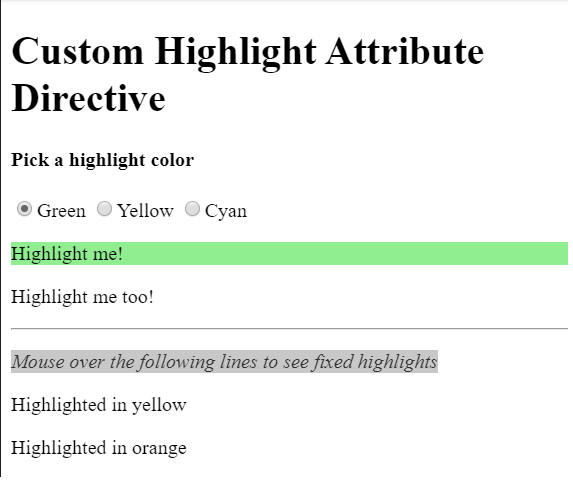<h1>Custom Highlight Attribute Directive</h1> <h4>Pick a highlight color</h4> <div> <input type="radio" name="colors" (click)="color='lightgreen'">Green <input type="radio" name="colors" (click)="color='yellow'">Yellow <input type="radio" name="colors" (click)="color='cyan'">Cyan </div> <p [appHighlight]="color">Highlight me!</p> <p [appHighlight]="color" defaultColor="violet"> Highlight me too! </p> <hr> <p><i>Mouse over the following lines to see fixed highlights</i></p> <p [appHighlight]="'yellow'">Highlighted in yellow</p> <p appHighlight="orange">Highlighted in orange</p>