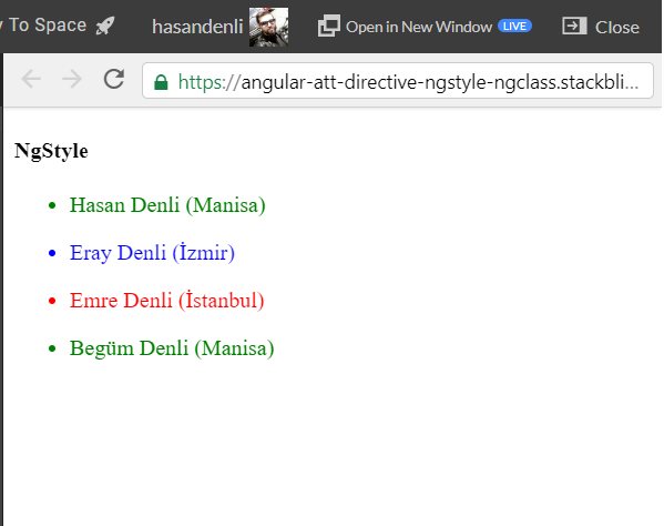 *ngFor Structural Directive’ini kullanarak people dizisi kadar li elementinin oluşmasını sağladık. Burada “ngClass” Directive’i sayesinde condition ile dom elementinin class attribute’ünü yönetebildiğimiz için yukarıdaki gibi kodumuzu geliştirdik.