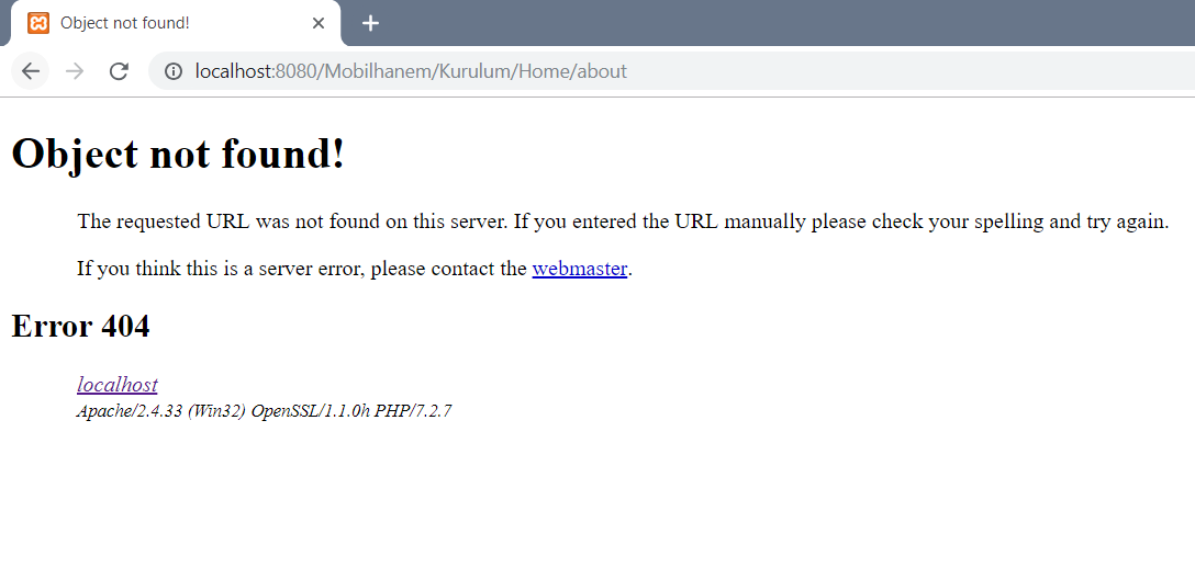 Bu kuralları yazdıktan sonra dosyayı kaydederek kapatmamız gerekmektedir. Bu kuralı yazdıktan sonra Controller’ larımızdaki Action’ larımıza http://localhost:8080/Mobilhanem/Kurulum/Controller_name/Action_name şeklinde istekte bulunabiliriz. Şimdi http://localhost:8080/Mobilhanem/Kurulum/Home/about şeklinde istekte bulunduğumuzda karşılaşacağımız sayfa aşağıdaki gibi olmalıdır.