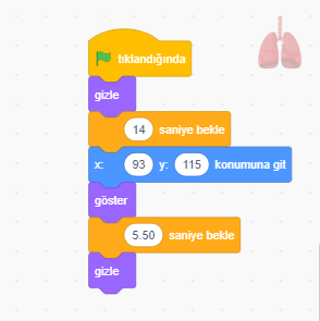 Konuşmalara paralel olarak çıkacak olan bu kukla için konuşmaya göre saniye belirledim. Gelelim şimdi scratch corona virüs animasyon videosu için akciğer kuklası kodlarına… Scratch olaylar menüsünden yeşil bayrağa tıklandığında bloğunu seçtikten hemen sonra Scratch görünüm menüsünden görün bloğunu da seçip yerleştiriyoruz. Scratch kontrol menüsünden 1 saniye bekle bloğunu seçip 1 yerine 14 yazıyoruz. Akciğerimizi Scratch te sahnemizde konumlanmasını istediğimiz yeri belirleyip oraya yerleştirdikten sonra hareket menüsünden konumuna git i seçiyoruz.