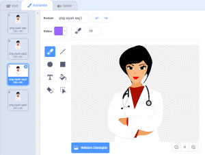 Bu Scratch ara yüzünde ise gözleri kapalı olan kuklanın kopyasını çıkartıyor ve aynı şekilde onun dudağındaki beyazlığı kapatıyoruz kopyasını çıkarttığımız kuklada. Unutmayın kuklaların görünüm sırası önemli o yüzden sizde de bu şekilde olsun sıralama eğer bu doktor kuklasını kullanıyor iseniz.