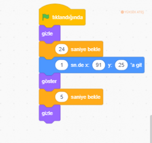 Ardından hız kesmeden Scratch hareket menüsünden konumuna git seçeneğini alıp üzerinde yazılı olan değerleri giriyoruz. Scratch görünüm menüsünden göster bloğunu, kontrol menüsünden 1 saniye bekle bloğunu alıyoruz ve 1 yazan yeri 4 yazarak değiştiriyoruz. Son olarak Scratch görünüm menüsünden gizle bloğunu alıp yerleştirerek bu kod parçasını da sonlandırıyoruz.